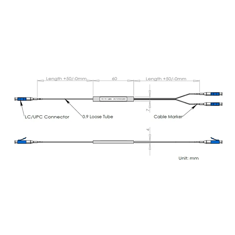 1 × 2 PLC Splitter acélcső csomag 60x7x4 mm, 900 μm -es laza csőhosszúsággal 1,0m, LC/UPC csatlakozó.