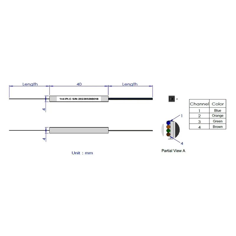 1x4/1 × 8 PLC Splitter Steel Cube csomag 40x4x4 mm, 250 μm csupasz szálas 2,5 +0,1/-0m, nincs csatlakozó.