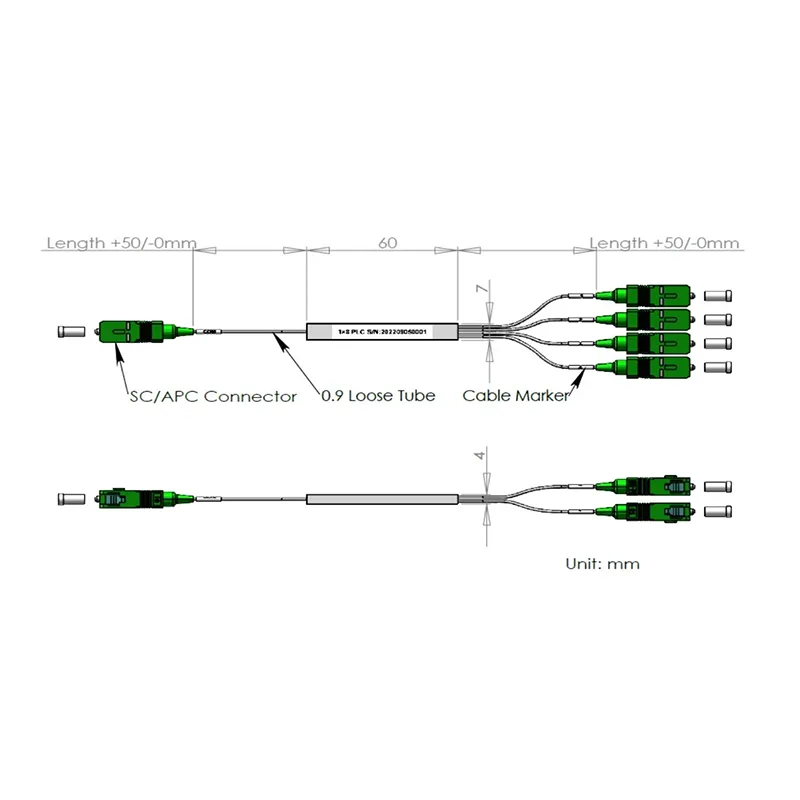 1 × 6 PLC Splitter acélcső csomag 60x7x4 mm, 900 μm-es laza csővel 1,0 +0,05/-0m, SC/APC csatlakozó.