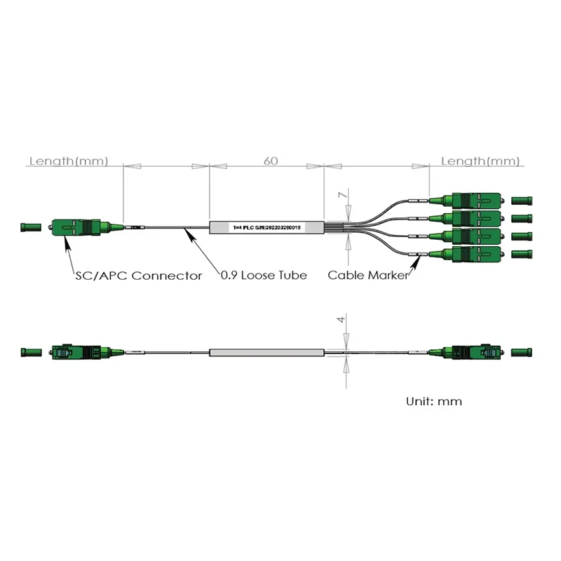 1x4/1 × 8 PLC Splitter Steel Cube csomag 60x7x4 mm, 900 μm-es laza csővel 1,0+0,1/-0m, SC/APC csatlakozó.